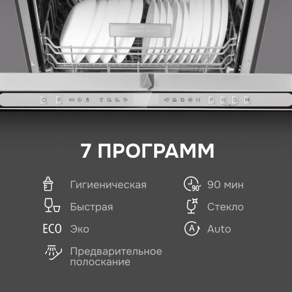 ECO (50°С, 198 мин) Быстрая (45°С, 30 мин) Стекло (45°С, 120 мин) 90 минут (55°С, 90 мин) Предварительное полоскание (15 мин) Auto (65°С, 150 мин) Гигиеническая (72°С, 195 мин) |