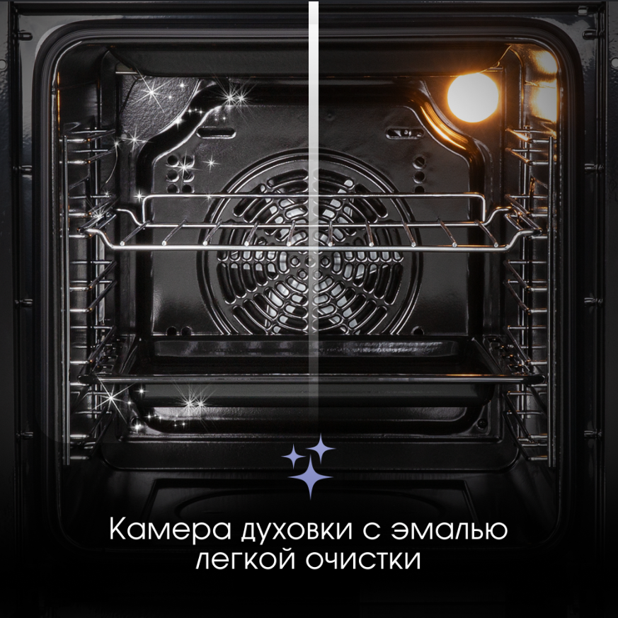 i Предполагает наличие встроенного вентилятора, который обеспечивает равномерное запекание благодаря непрерывной циркуляции горячего воздуха.