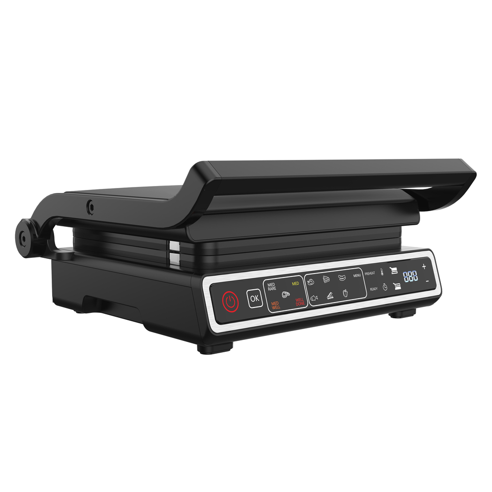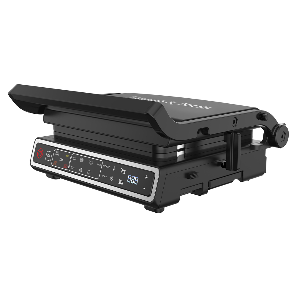 2 съемные двусторонние панели которые можно мыть в посудомоечной машине, яркий сенсорный дисплей, индикация степени прожарки стейка, декоративный рельефный логотип на крышке, ТЭН встроен в съемные панели |