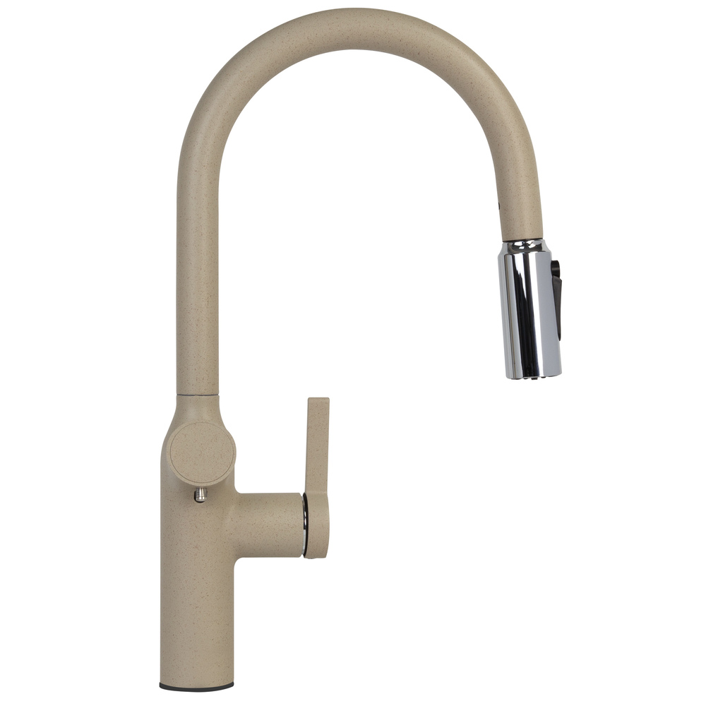 i Встроенная в кран насадка на длинном гибком шланге с металлической оплеткой. Насадки с кнопкой могут переключать обычный излив воды на душ.