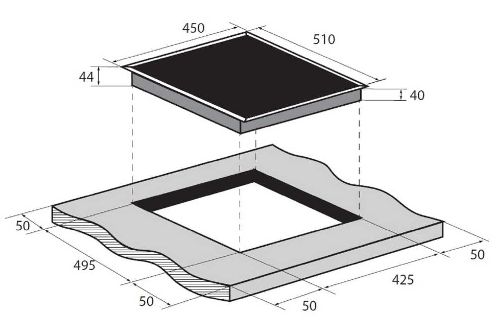i Характер огранки фаски на внешней стороне варочной панели. Металлические рамки предотвращают забивание монтажных швов крошками и пылью.