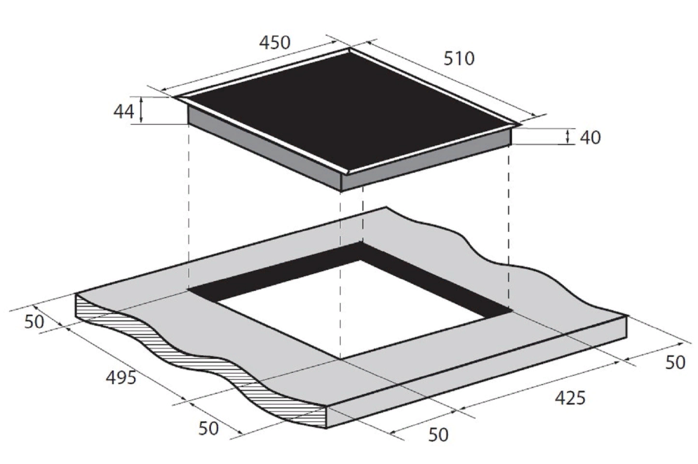 i Характер огранки фаски на внешней стороне варочной панели. Металлические рамки предотвращают забивание монтажных швов крошками и пылью.