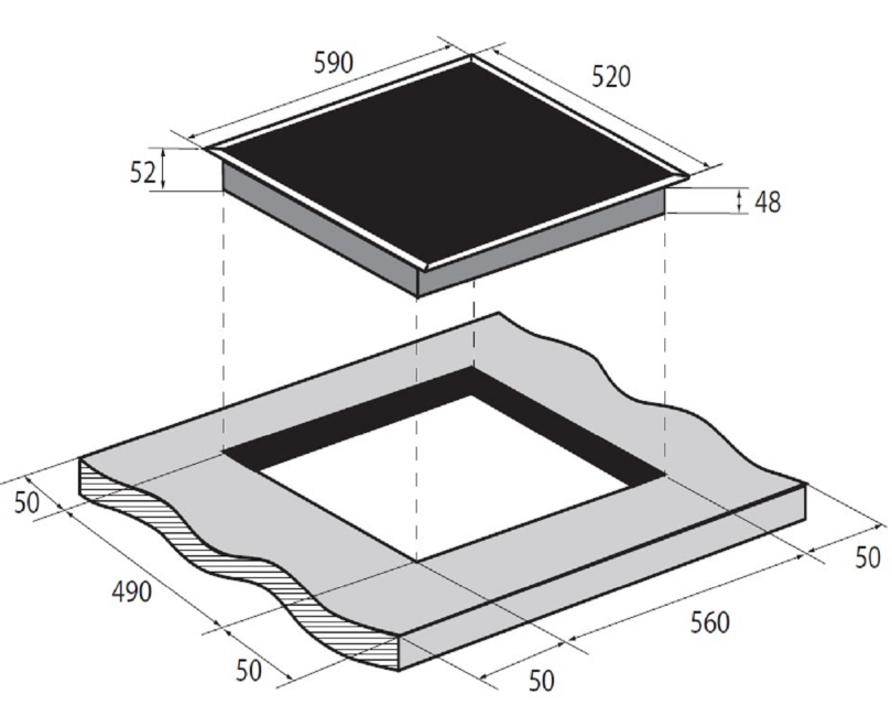 i Характер огранки фаски на внешней стороне варочной панели. Металлические рамки предотвращают забивание монтажных швов крошками и пылью.