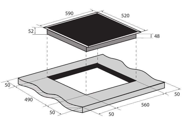 i Характер огранки фаски на внешней стороне варочной панели. Металлические рамки предотвращают забивание монтажных швов крошками и пылью.