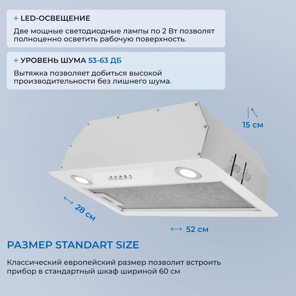 i Большинство вытяжек оснащены лампами, направленными на варочную панель. От типа лампы зависит энергопотребление и особенности освещения.