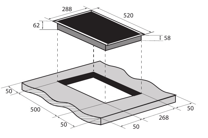 i Характер огранки фаски на внешней стороне варочной панели. Металлические рамки предотвращают забивание монтажных швов крошками и пылью.