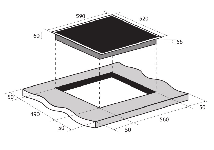 i Характер огранки фаски на внешней стороне варочной панели. Металлические рамки предотвращают забивание монтажных швов крошками и пылью.