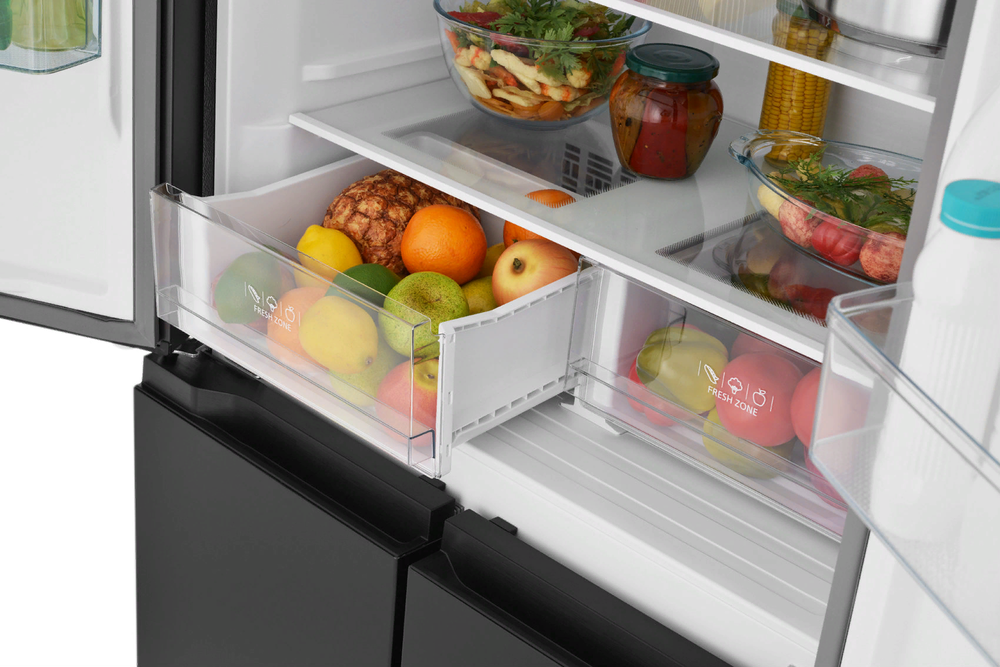 i В зоне свежести температура держится на уровне 0°С, так продукты дольше остаются свежими. Подходит для свежего мяса, рыбы, фруктов, овощей.