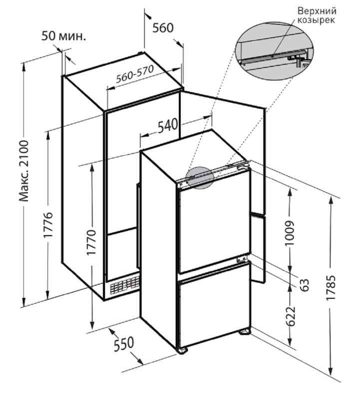 i Морозильная камера может быть расположена сверху, снизу от основной камеры, Side-by-Side. Также она может отсутствовать вовсе.